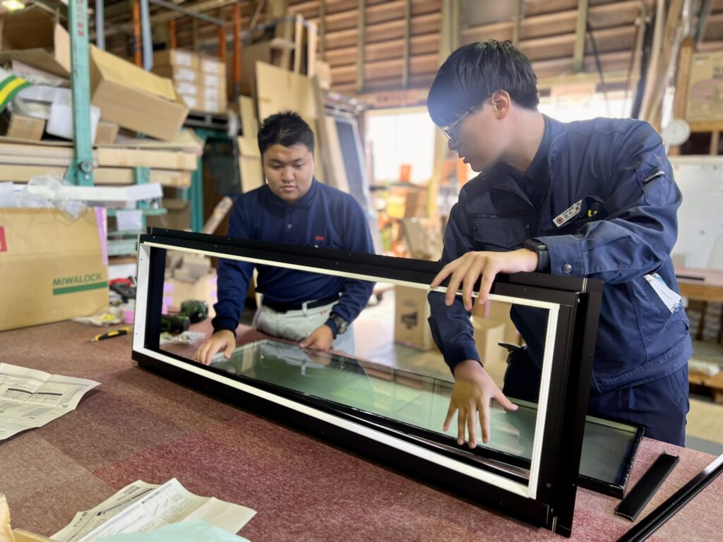 この日は、若杉くんにフィックス窓の組立てを手伝ってもらいました。趣味がDIYということもあり、慣れた手つきでサクサクと作業を進める姿に、スタッフからは思わず感嘆の声があがりました。