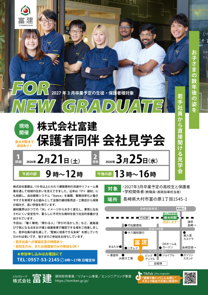 富建(TOMIKEN)は、110年以上にわたり地域を支えてきた老舗でありながら、自社開発システム「Stance」を展開するなど、常に新しい挑戦を続けています。今回の見学会は、単なる会社説明ではありません。 「どんな環境で、どんな人と、どう成長できるのか?」 実際に働く若手社員の姿を、ぜひご自身の目で確かめていただきたいと思っています。