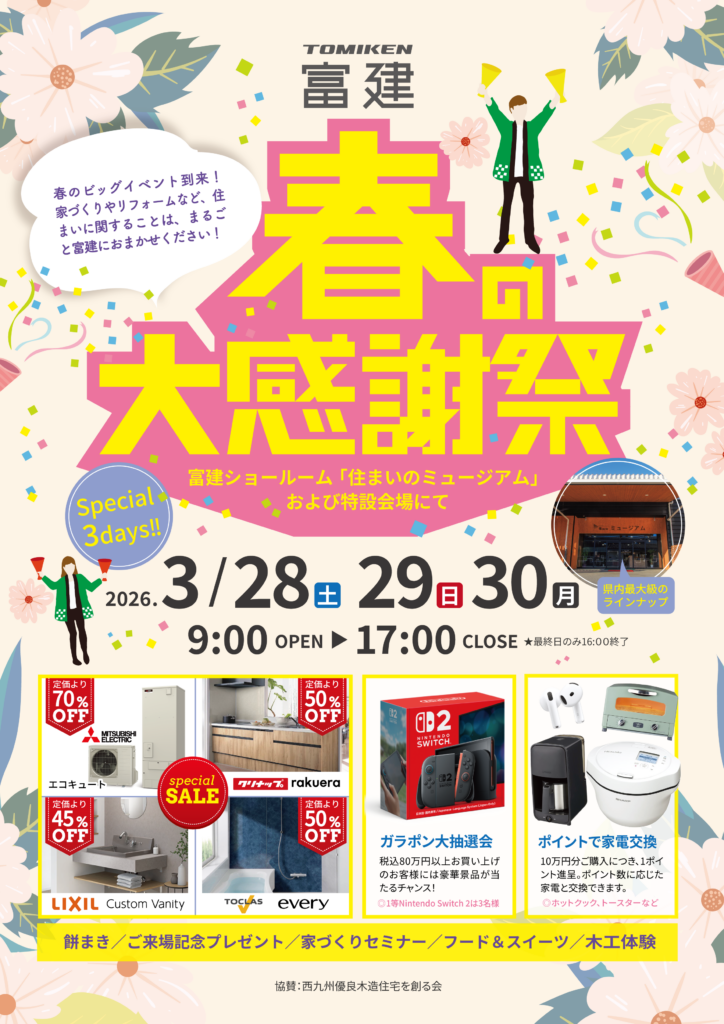 ・お楽しみイベント満載: 「餅まき(各日15:00〜)」や、木工体験、ディスポーザ実演など家族みんなが楽しめるイベント用意!